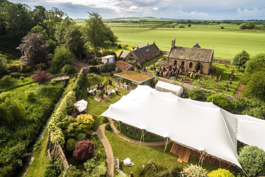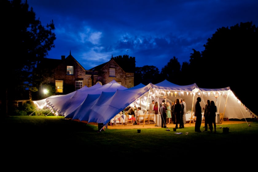 Like with traditional wedding marquees, you can easily use a stretch tent to cover the whole seating and ceremony area. While traditional wedding marquees are quite limited, stretch tents offer you the option of having the sides up or down.